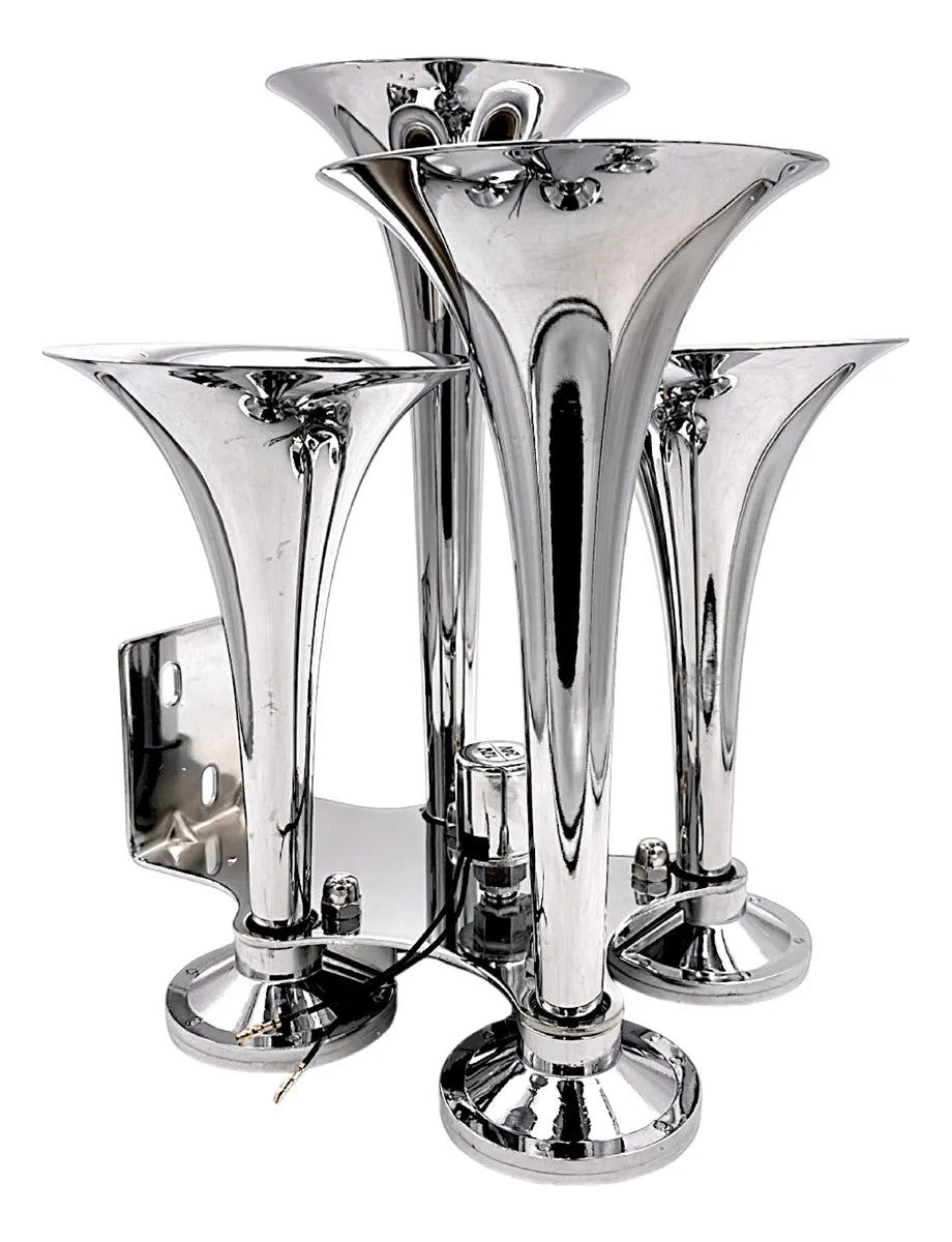 Corneta Tipo Tren Cuádruple de Acero Cromado Para Camión Mix de Aire y Eléctrica de Excelente Calidad y Diseño de 12V-24V