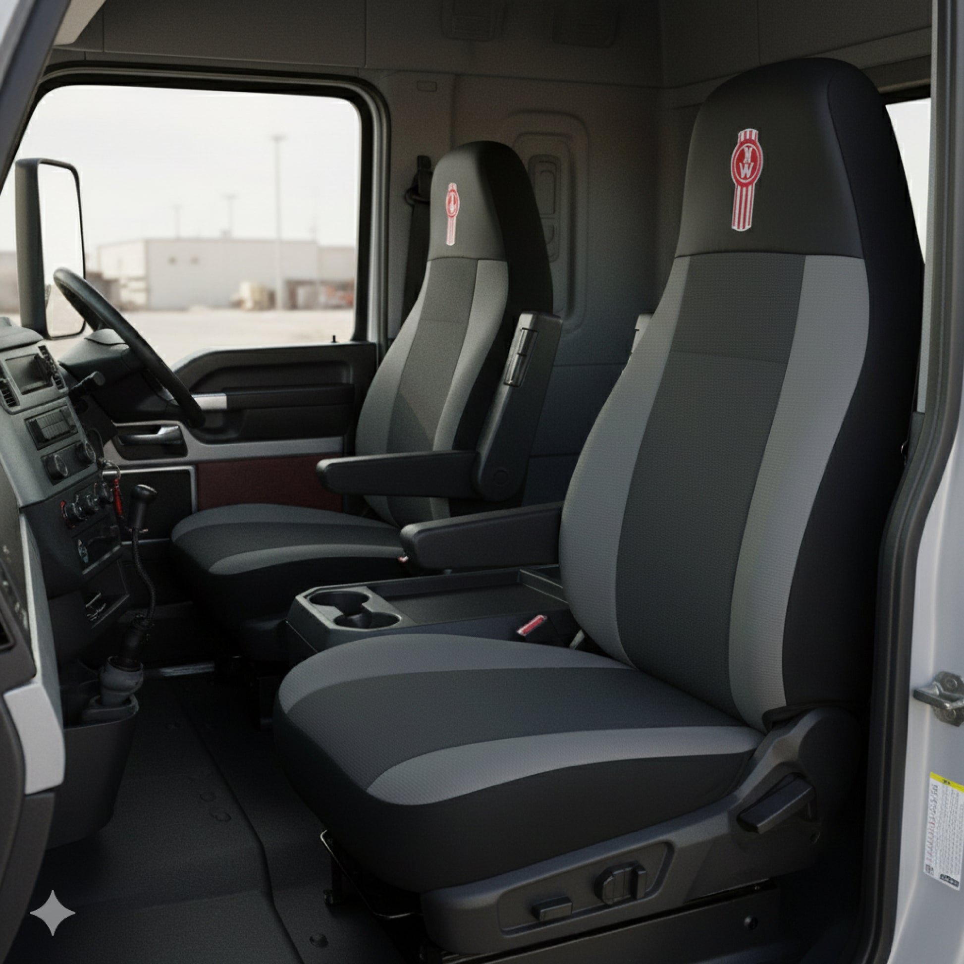Cubre Asiento de Tela con Diseño de Kenworth Guitarrón T680-T880 Negro-Gris de Excelente Calidad y Diseño Par